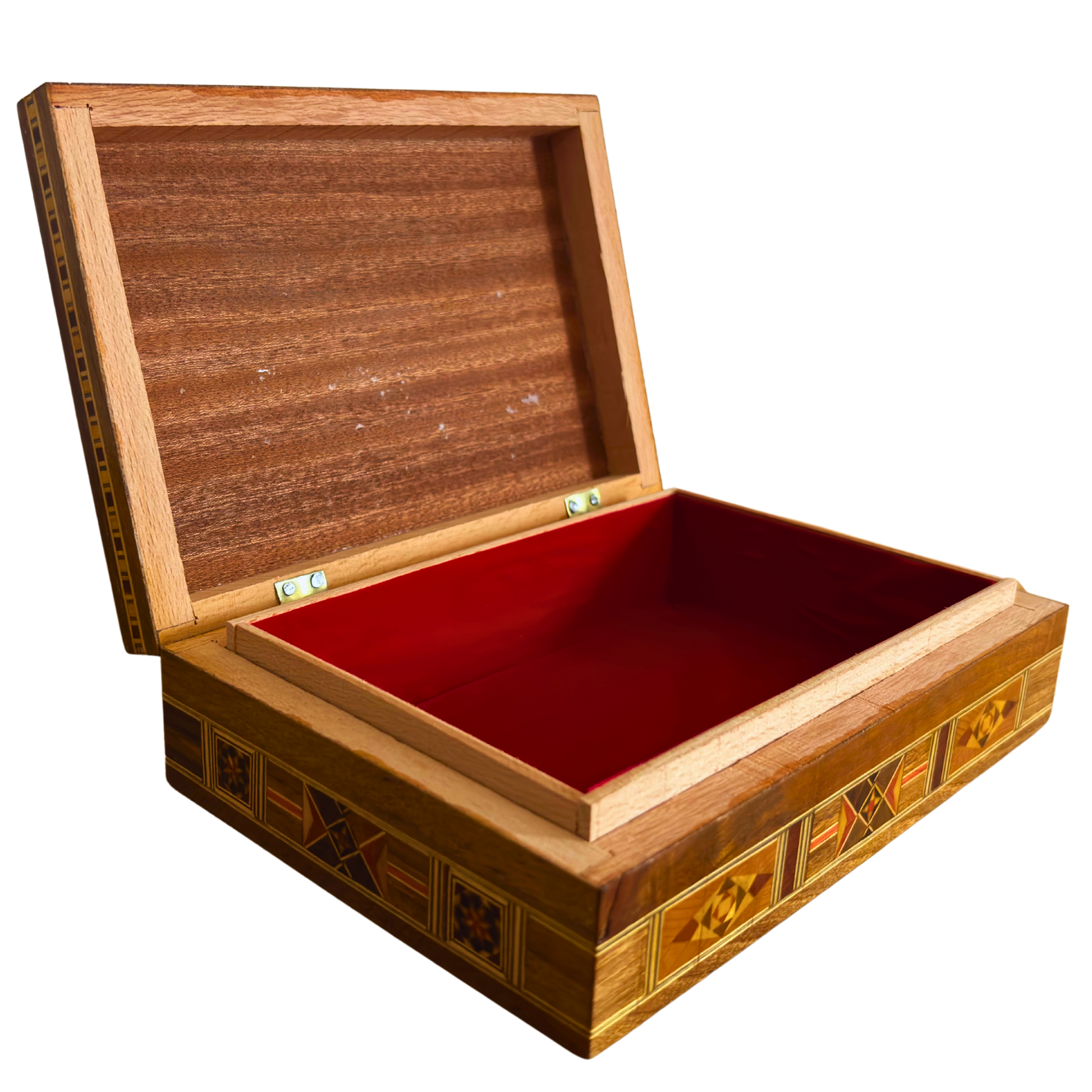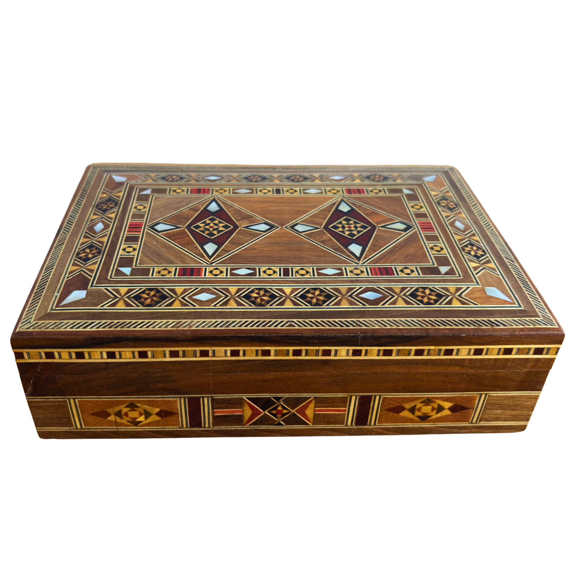 Deze elegante middelgrote mozaïekdoos is met zorg met de hand vervaardigd door ambachtslieden, met gebruik van walnoot-, beuken-, citroen- en geeldennenhout. De doos is prachtig ingelegd met glinsterend parelmoer en toont traditionele Damascene geometrische patronen die het rijke erfgoed van Syrische kunst weerspiegelen.